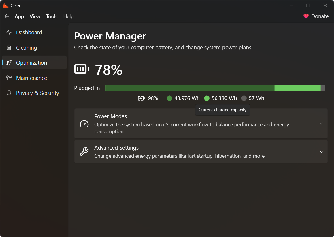 Create and switch power plans, monitor battery wear, and adjust performance or efficiency as needed.
